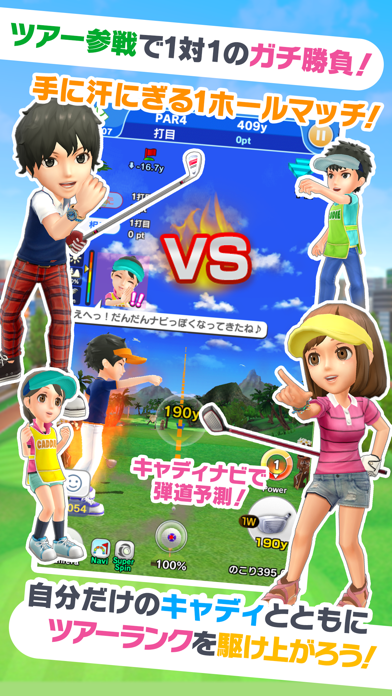 ひとりでゴルフ・みんなでゴルフなどさまざまな遊び方が用意されています。レベルが上がるとツアーやランク戦にも参加可能に。優勝を目指して自分の力を試してみましょう。