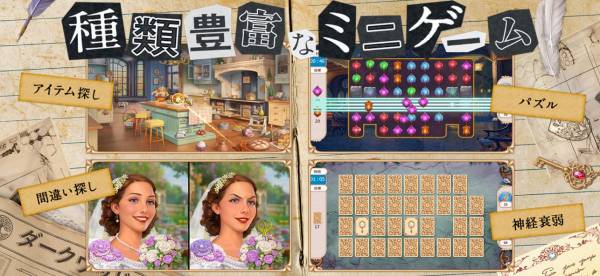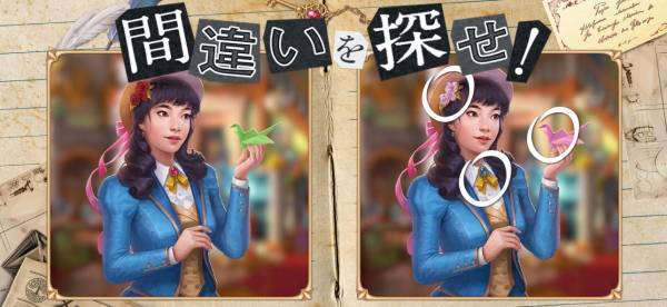 アイテム探し以外にも、パズルや間違い探しなど多彩なゲームで遊べます。パズルは手数制限があり、効率よく解かなければなりません。間違い探しは2つの画像を比べて、間違っている箇所をタップして指摘します。