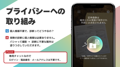 無料で気軽に保険の相談ができるアプリ。スマホで撮影した保険証券をアップロードするだけで、プロの分析による手厚い診断を受けられます。個人情報は隠せるので、プライバシーも安心。無料チャットで相談ができる機能もあり、自分にピッタリの保険がわかります。