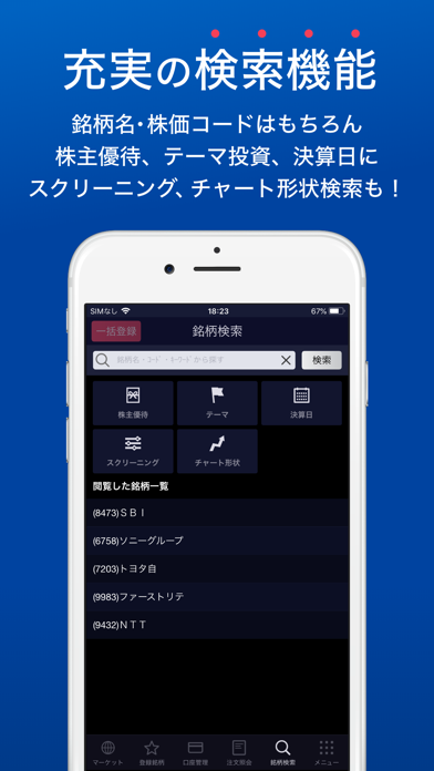 銘柄を買う際には、まず希望の銘柄を検索します。キーワードから直接銘柄名を入力して検索できるほか、テーマや株主優待・スクリーニングなど多彩な検索方法があります。