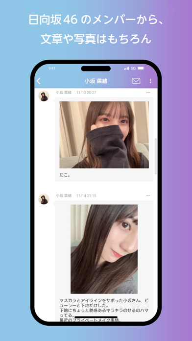 日向坂46とのコミュニケーションアプリ。1メンバーあたり月額300円でトークを定期購読することができます。さらに1通あたり120円でメンバーにメッセージを送ることも可能。自分の思いも伝えられる、ファンにはたまらないアプリでしょう。