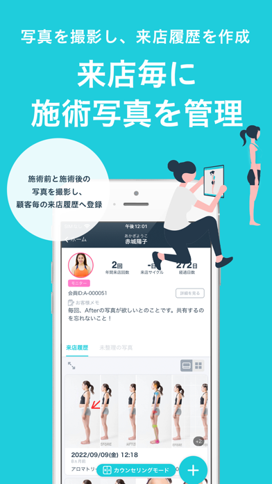 お客様のビフォーアフター写真や同意書、カウンセリング内容まで、必要な情報をスマホひとつでまとめられる顧客管理アプリです。受付や施術前の準備がスマートになるので、サロン業務の時間と手間をしっかり削減。見た目の変化も伝えやすく、お客様の満足度アップにもつながります。