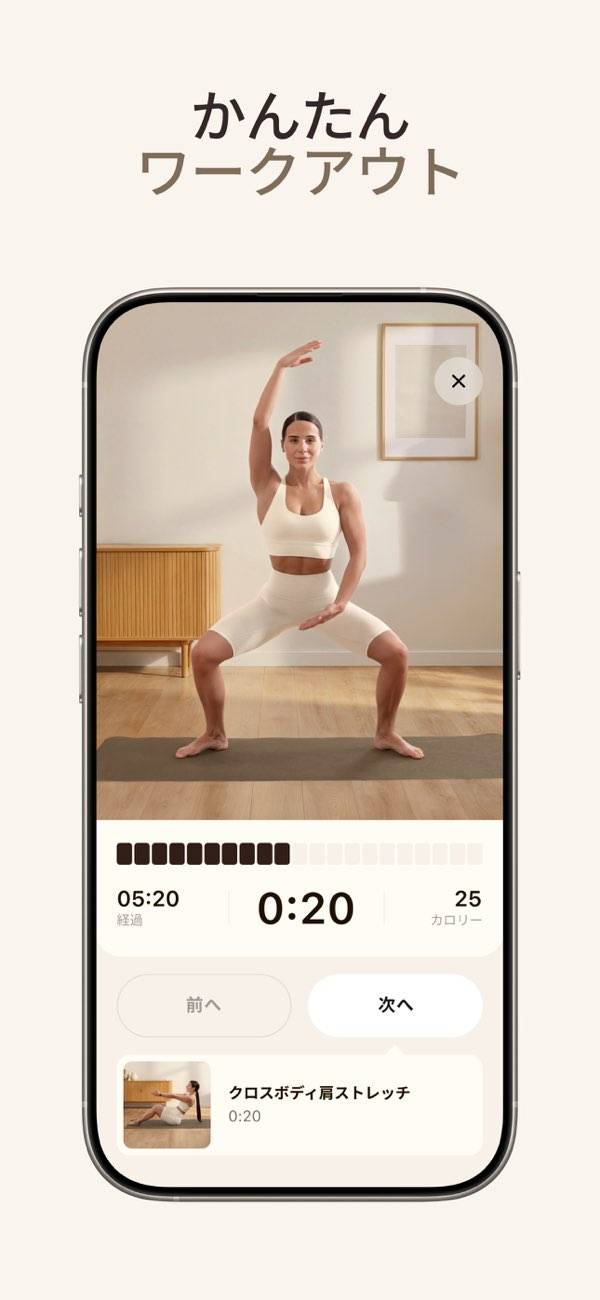プロフィールに合わせたワークアウトプランが見られ、動画で身体の動かし方がわかります。休憩時間、準備時間、トレーニング時間と合わせてタイムを計算。消費カロリーも表示されるので、1日ごとの成果がわかりやすいでしょう。
