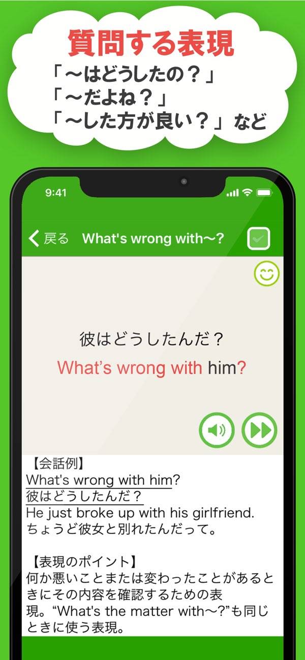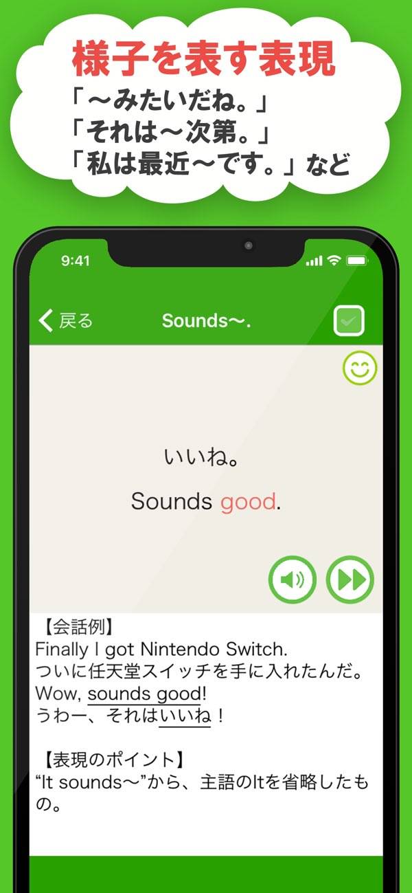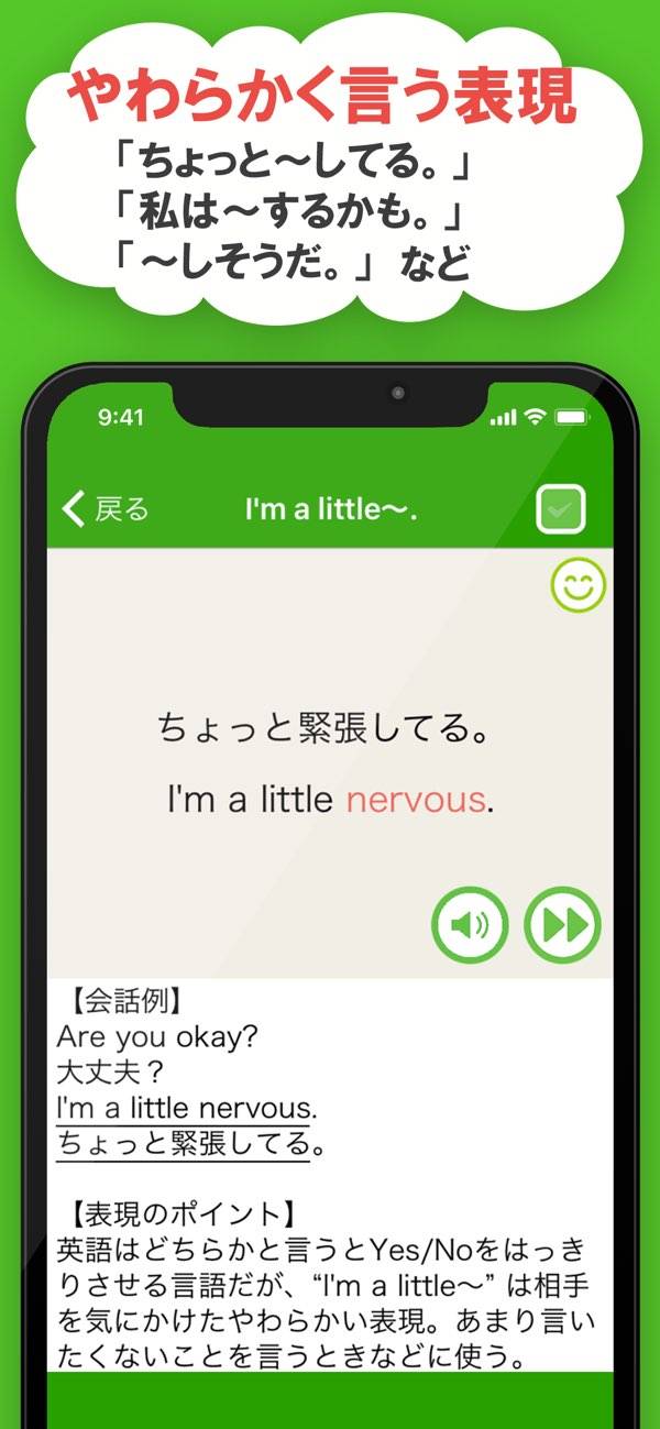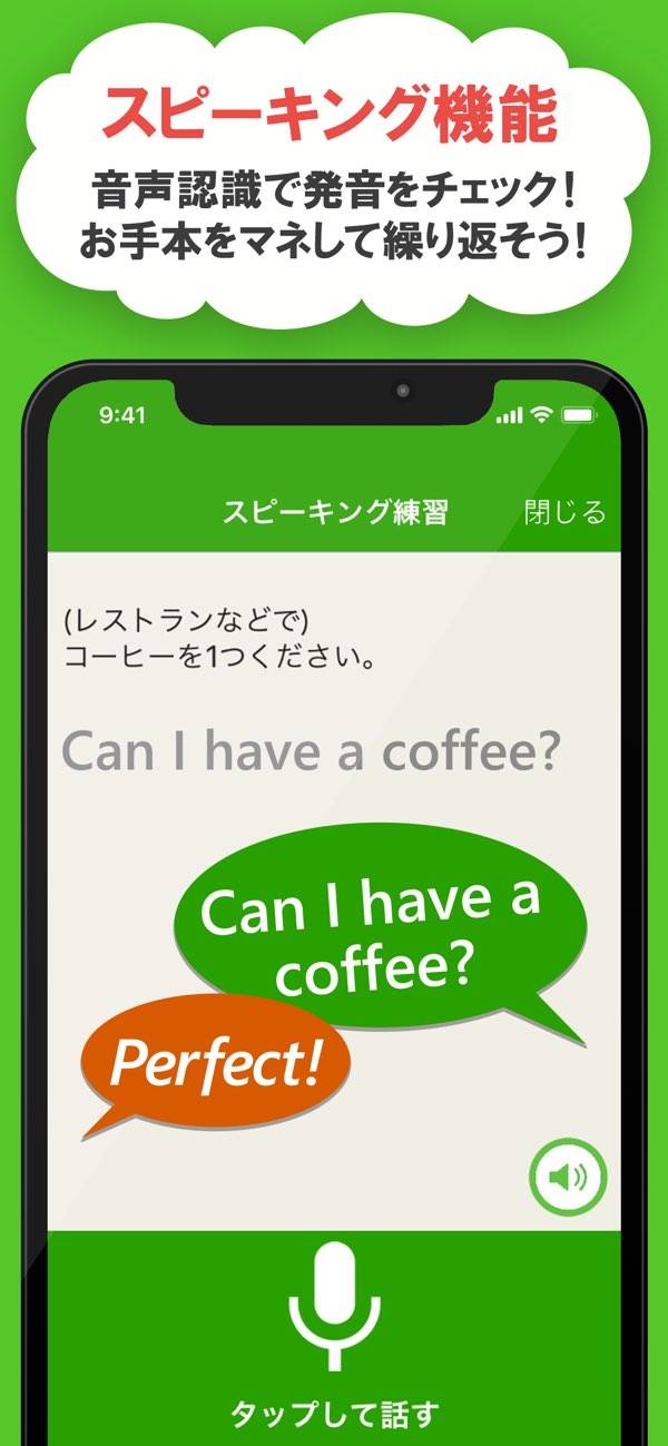 ネイティブスピーカーの音声を聞ける機能があり、発音練習機能も搭載。自分の発音を録音し、自動採点でフィードバックを得られるので、正しい発音を身につける手助けになります。表現のポイントなども知ることができ、話せるフレーズの幅が広がります。