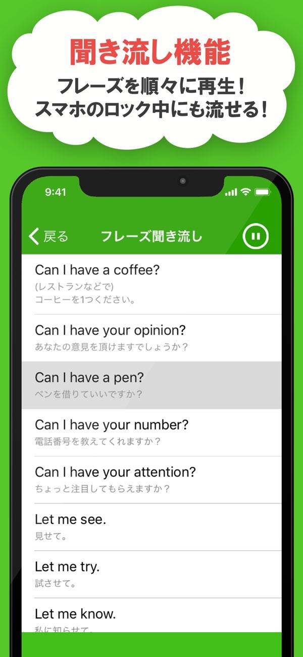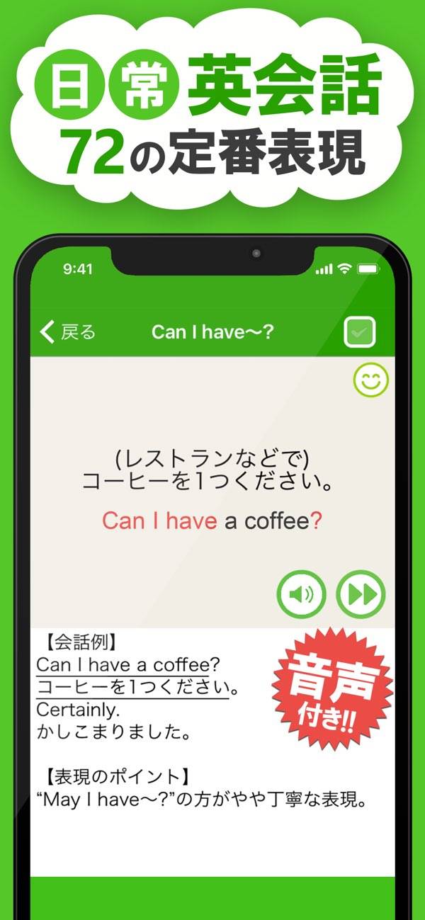 実用的なフレーズを豊富に収録し、ネイティブの発音も聞けます。聞き流しながら学習でき、発音練習もできるので、英語の実践力を身につけたい方に最適。フレーズで覚えることができ、単語を入れ替えるだけで応用ができます。
