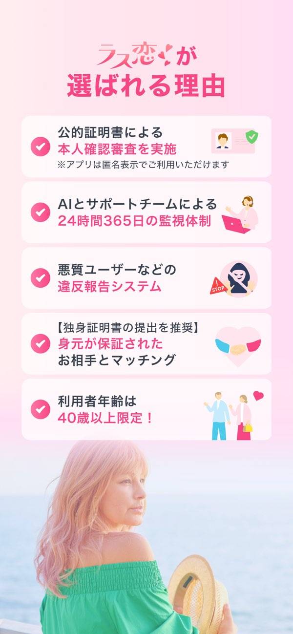 40代・50代・60代のユーザーが中心。ほかのマッチングアプリは20代~30代が多く、なかなか同世代の相手に出会えないと感じた人にぴったり。大人の落ち着いた雰囲気で話題が合うパートナーを探しができます。