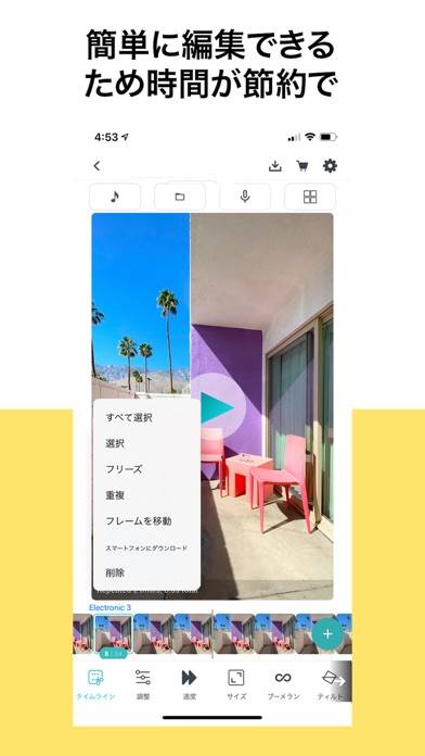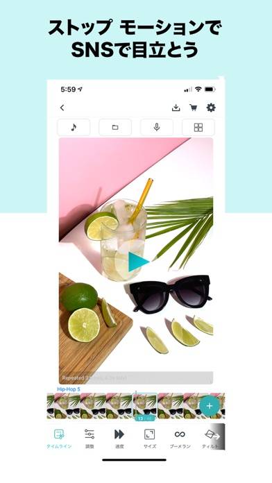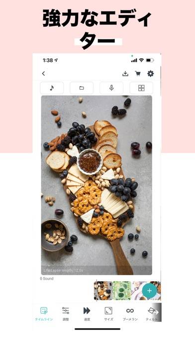 写真はタイムラインエディターで並べ替えや削除、複製などで編集します。速度調整、リバースといった加工で動き方に変化を与える機能も搭載。
