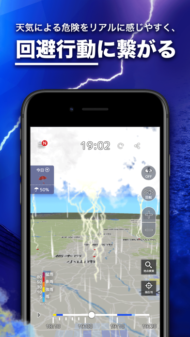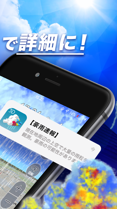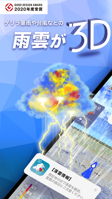 画期的な3D表示で、雨雲の動きを視覚的に捉えられるアプリです。3D表示で、雲の厚さや雲ごとの雨量のレベルなどがわかることが、ほかの天気アプリとは異なる魅力ポイント。