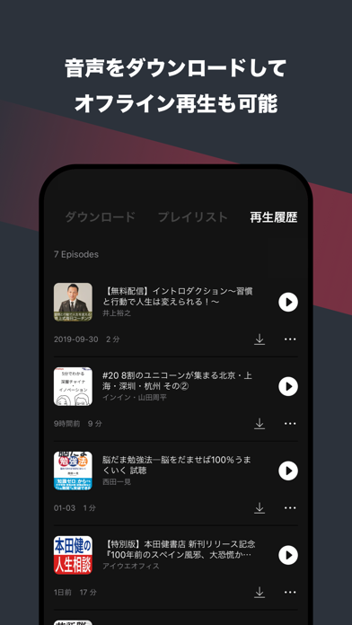 気になるエピソードはプレイリストにまとめて、自分だけの学習リストが作れます。種類の異なる番組を組み合わせたり、テーマで整理したりできるので目的に沿って整理しやすいのが魅力。あらかじめダウンロードしておけば、地下鉄や飛行機内でも音切れなく楽しめます。