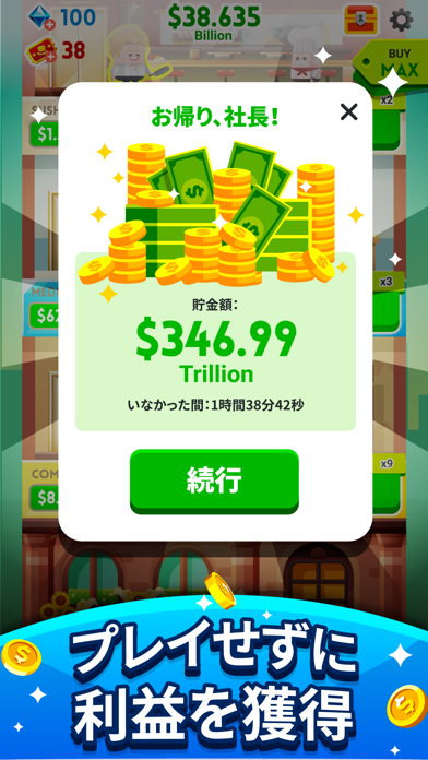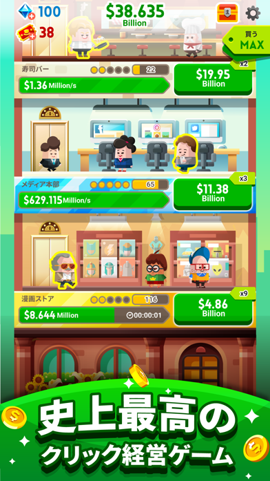あなたはビルの経営者になり、大富豪を目指します。新しい事業をどんどん導入すれば億万長者も夢じゃない! 遊び方はタップだけの簡単操作です。まずはドルのボタンをタップして単価を上げて、資金を回収しましょう。また雇ったマネージャーが資金を自動で集めてくれるので、操作しなくてもお金がどんどん貯まります。