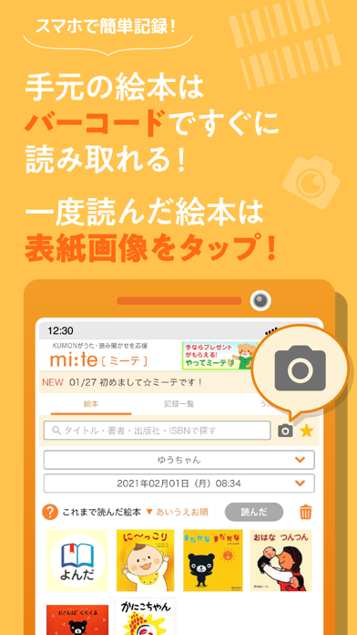 絵本やうたの記録は画像をタップするだけで登録できます。バーコードを読み取れば絵本情報がすぐ反映されるため、本棚の整理のような感覚で登録可能。