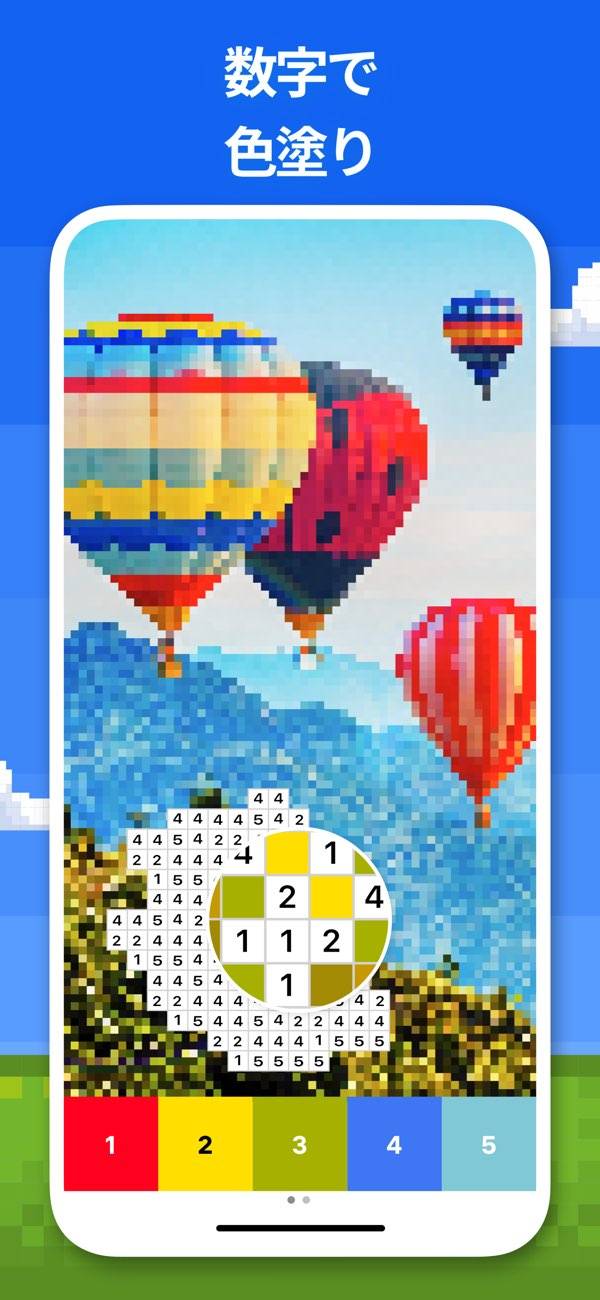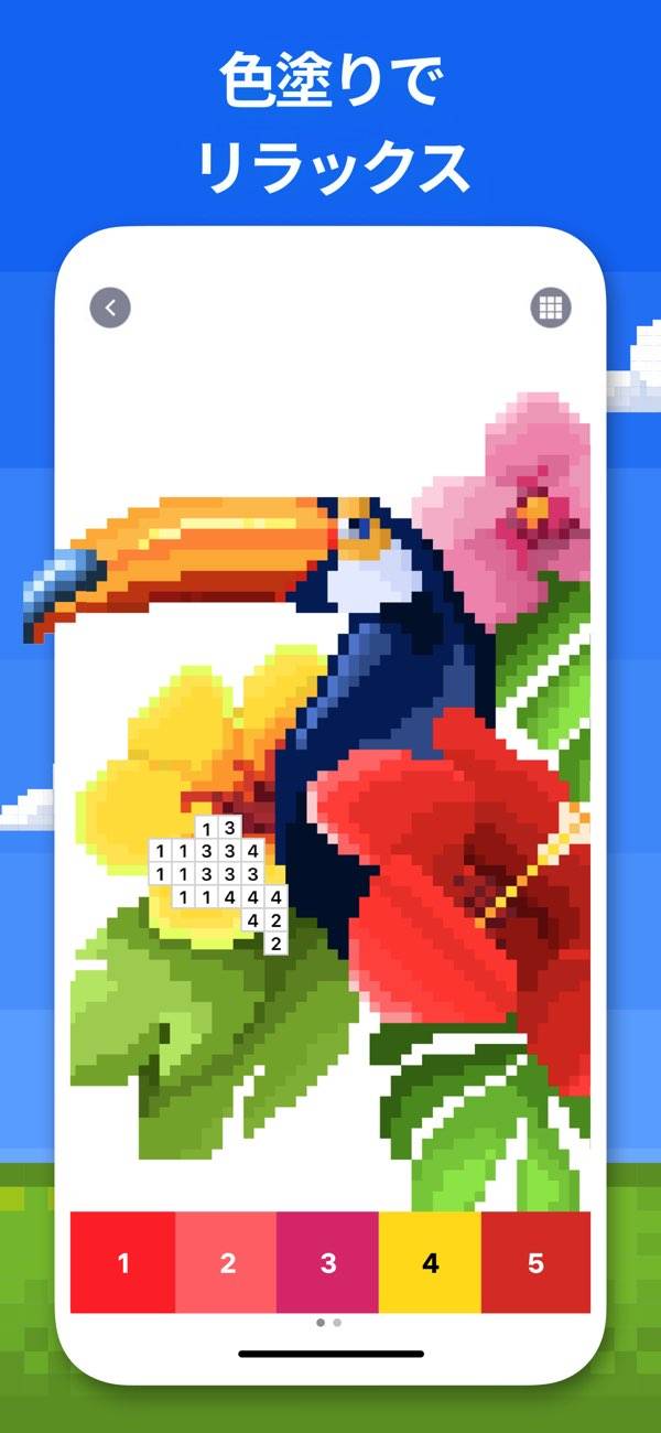数字の一致したマス目を塗っていく塗り絵アプリです。誰でも簡単・着実に進み、達成感を味わいやすいのが特長。