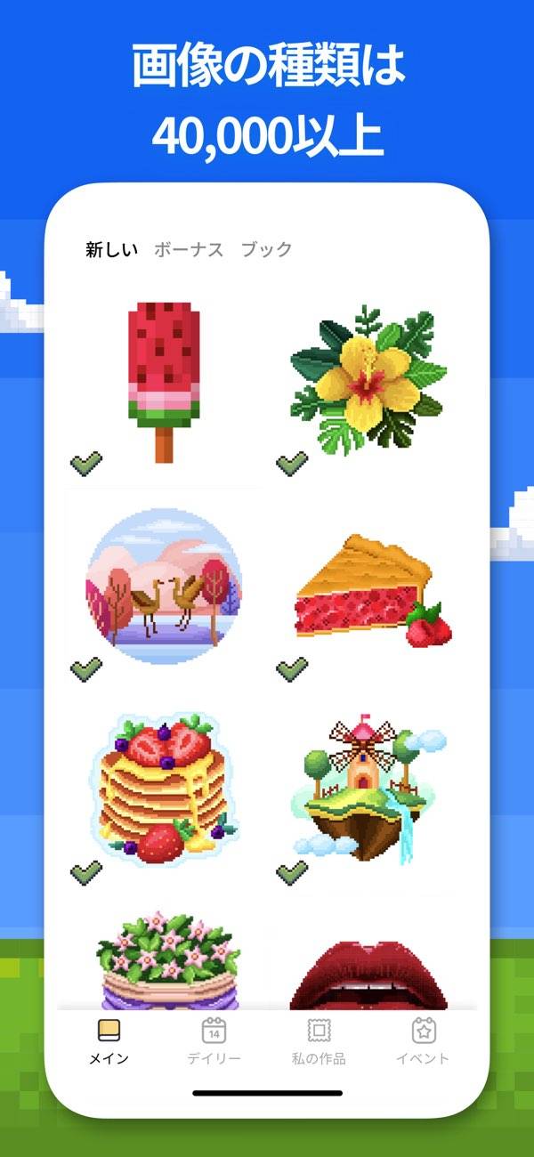 簡易的な絵から、写真風の細かいタッチの絵まで収録。ドット風の絵に仕上がるので、なかなか味のある1枚になるでしょう。鍵がかかっている絵は有料ですが、動画広告を視聴することでも塗れるようになります。