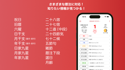 年暦から日暦まで、暦に関連するさまざまな情報をチェックできるアプリです。年間の祝日を把握したり、日干支や九星気学など占いで使われる情報をチェックしたりと、多様な使い道があります。
