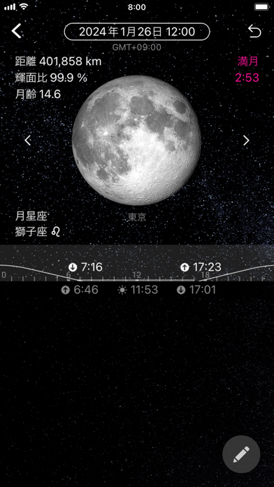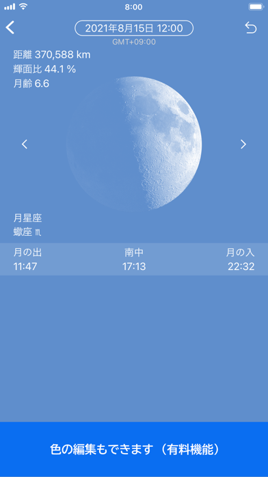 - 距離や輝面比、月の出と月の入の時間など、詳細な情報を閲覧できる