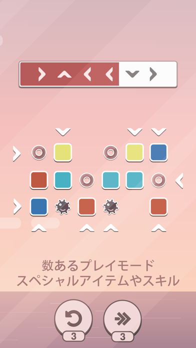 画面上に配置されている矢印ボタンを押してブロックを移動させます。ステージ毎にブロックを動かせる回数に制限があるため、どのような動きをするか予測してから移動させましょう。徐々にブロックが多くなったり、配置が複雑になったりと論理的思考力が問われるゲームになっています。頭をフル回転させてクリアへの道を見つけ出してください。