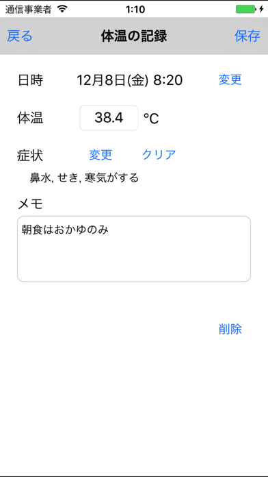 - 鼻水やのどの痛みなど体調メモもつけられる