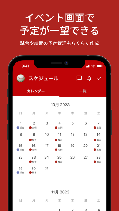 試合やミーティングなどチームのスケジュールと出欠を管理。チームメンバーとカレンダーを共有できるので、今後の予定のすり合わせがスマートに進み、マネジメントの負担を減らしてくれます。操作もシンプルで、一緒に使うメンバーも覚えやすいでしょう。