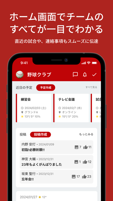 ホーム画面に投稿して、情報やアンケートなどをチームメンバーに共有可能。画像も見せられるほか日程調整や集金依頼もでき、チームでの連絡に必要な機能がそろっています。スケジュール以外の情報共有もスムーズになるでしょう。
