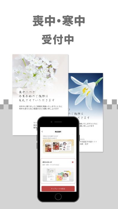 1年中使える挨拶状・ポストカード作成アプリです。年賀状はもちろん、暑中見舞い、結婚報告、クリスマスなど、たくさんのデザインテンプレートが用意されています。