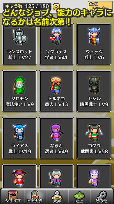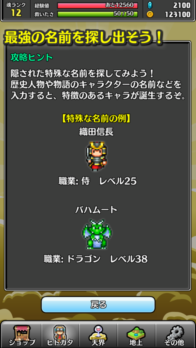 入力した名前に合わせたキャラが誕生するRPG。戦国武将の名前を付けると侍に、お笑いの人の名前を付けると芸人に... ここまで対応してるの!?っていうネタもあって、かなり芸が細かい(笑)作ったキャラは育てて転職させられたりもするし、やり込み系RPGとしてもちゃんと楽しめるんだぜ!