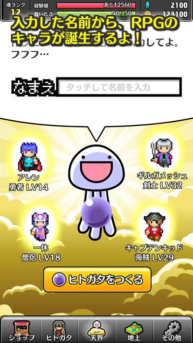 本作では名前がとても大事。入力する名前によって、誕生するキャラが変わります。強い勇者か? 雑魚キャラか? それは、あなたのネーミングセンス次第。