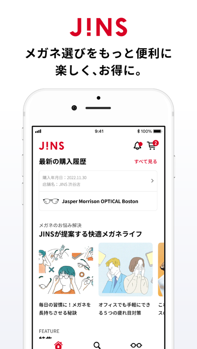 メガネのデザインが掲載されている、アイウェアブランドJINSの公式アプリです。メガネを購入した際、度数情報や保証書の管理を怠ってしまう……という方におすすめ。アプリ内で管理できるので、紛失の心配がありません。