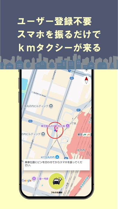 スマホを振るだけで、タクシーが呼べる配車アプリ。アプリを起動し画面を点滅させた状態でスマホを振ると、近くのドライバーが気づいてくれるという仕組みです。マップには近くを通るタクシーが表示されるため、アプリに対応してくれた車がすぐわかります。