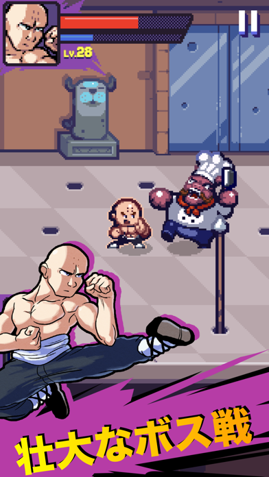 ドットで作られた、なつかしさを感じるスクロールアクションゲームです。横スワイプで敵を投げたり、上スワイプで飛び蹴りしたり、技が多彩でキャラクターの動きが軽やか。アクロバティックな操作が楽しく、中毒性があります。