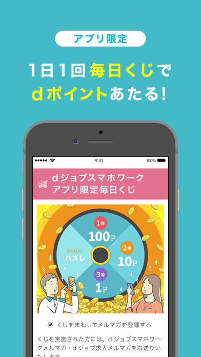 アプリ限定のdポイントが当たるくじやキャンペーンに参加することが可能。また、「プロフィール登録」や「お仕事5回」など、用意されたミッションをクリアすることでもポイントを貯められます。ポイント獲得のチャンスが豊富なのは嬉しいですね。