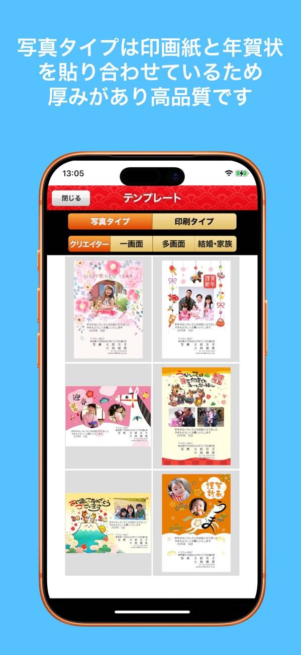 お気に入りの写真を選ぶと、顔が見える年賀状が作れます。さらに動画や音声を読み込めばQRコード付きで届けることができるので、孫の「明けましておめでとう!」の声を祖父母に届けるといった使い方も可能です。声や動く姿があると、遠くにいてもぐっと近くに感じられますよ。