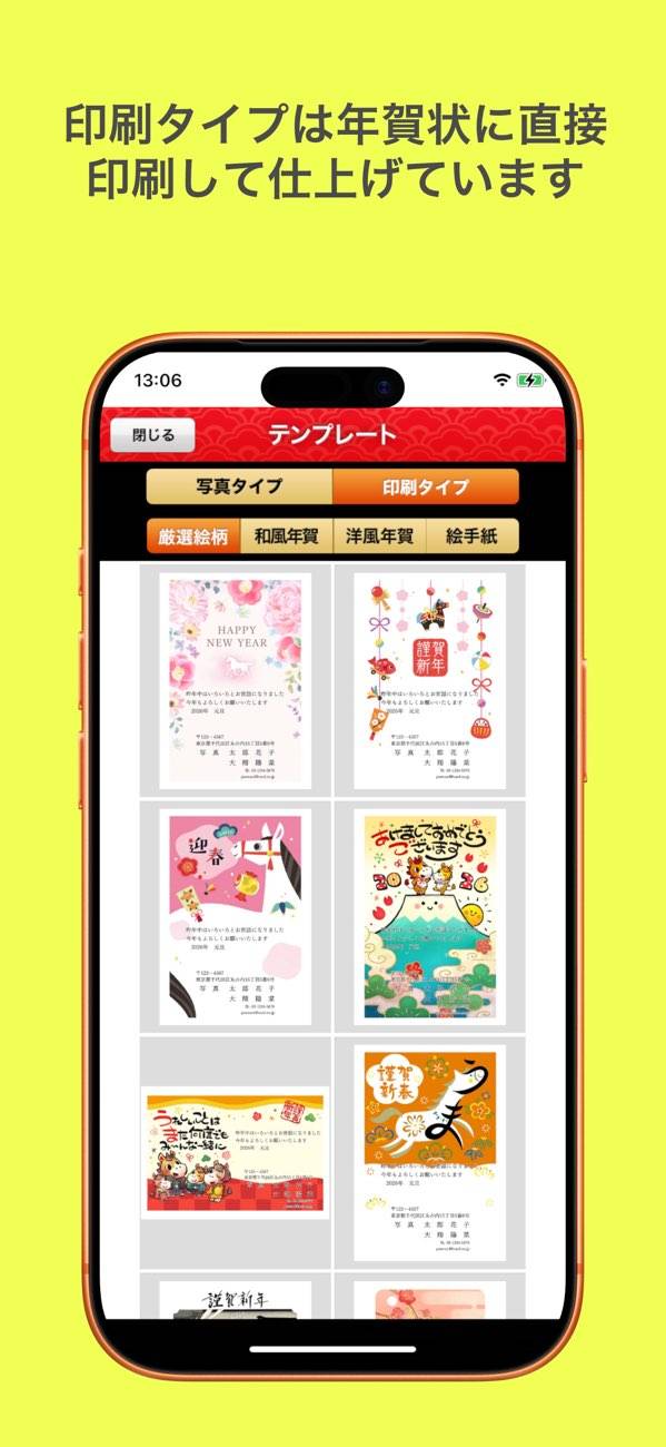 操作はとてもシンプルで、スマホに不慣れな方でも迷わず使えます。テンプレートは99種類から選択でき、写真がない場合は文章だけでもOK。完成したあとはアプリから枚数を選んで注文すれば、3営業日後には自宅に届くので、プリンターがなくても年賀状の準備ができます。