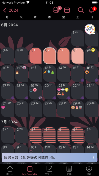 生理開始日・生理周期を入力すると、次の生理開始日を測ってくれるカレンダーアプリ。生理予想日や排卵日を色とアイコンで見やすく表示してくれます。円形のカレンダーが特徴的で、1ヵ月のサイクルが確認しやすく便利です。