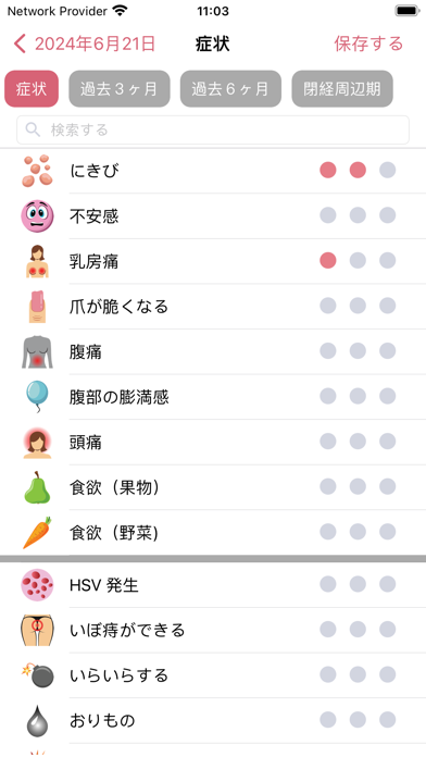 ▲日ごとに気分や症状といった、様々な体調の変化が記録できる。自己管理にぴったり。