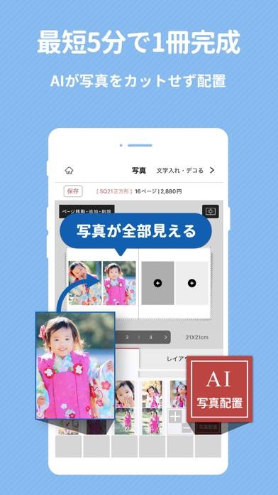 ただし、1ページあたりの価格が147.8円と高いため、コスパを重視する人には少し厳しいかもしれません。フォトブックのクオリティや自由度を最優先に考えるなら、これ以上のアプリはなかなか見つからないでしょう。