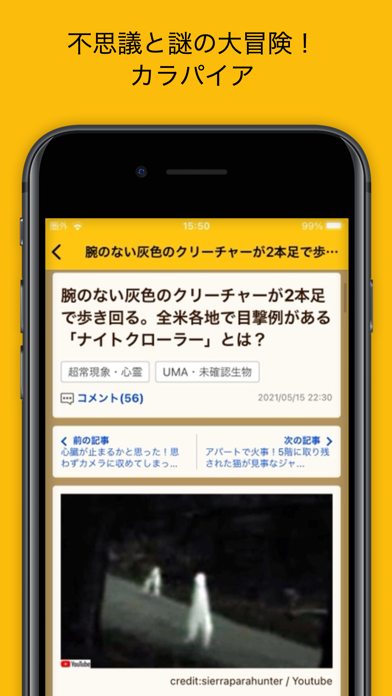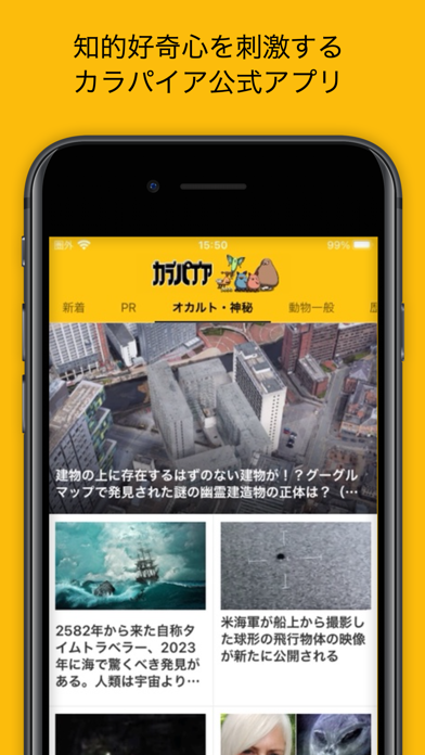 海外のニュースサイトを中心にオカルト、面白、動物、歴史、不思議など様々なジャンルの情報を日本語で紹介するまとめコンテンツ「カラパイア」のアプリバージョン。