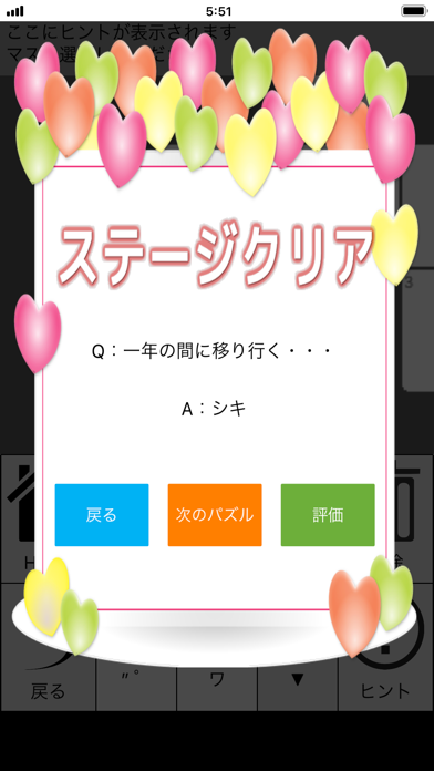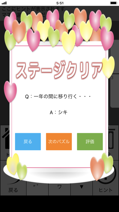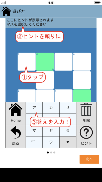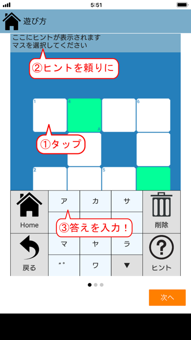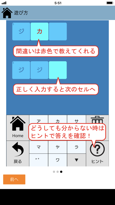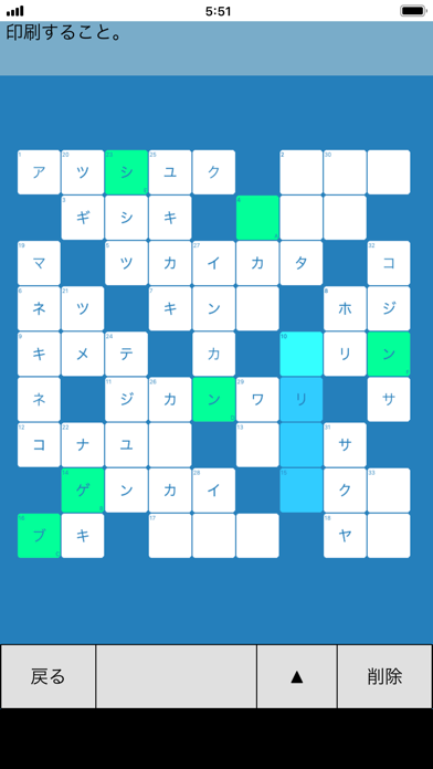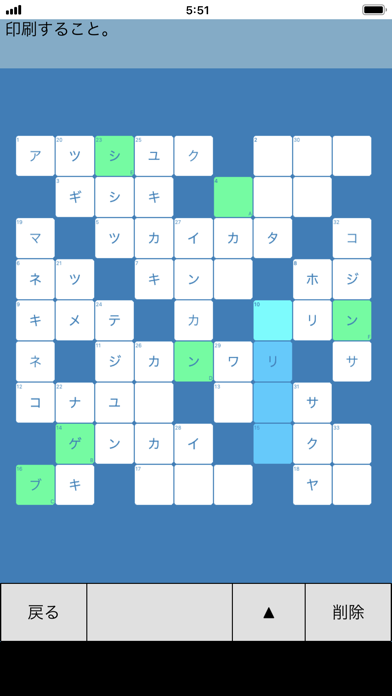 入力したいマスをタップしてキーワードを入れていきます。アプリ専用のキーボードは記号やアルファベットなど余計なものが無くシンプルに使いやすいデザイン。その他のアイコンも大きく、見やすさがうれしいです。