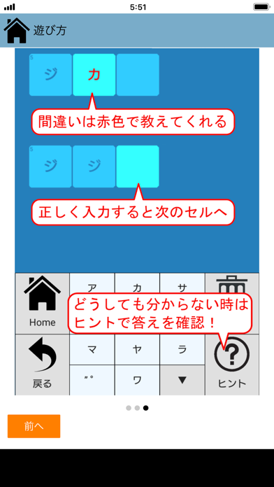 オーソドックスなクロスワードパズルが楽しめます。マスをタップするとヒントが表示されるので、当てはまる単語を考えて入力しましょう。文字チェック機能をONにしておくと、間違った文字を赤字で表示してくれるのでわかりやすいです。
