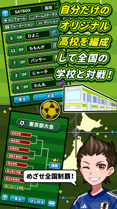 フォーメーションや選手の配置転換といった編成を行います。選手の名前も好きに変更できるため、友達や家族、有名なサッカー選手に変更してみてください。