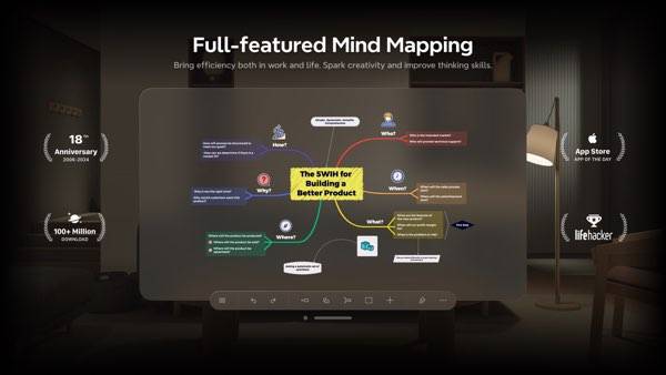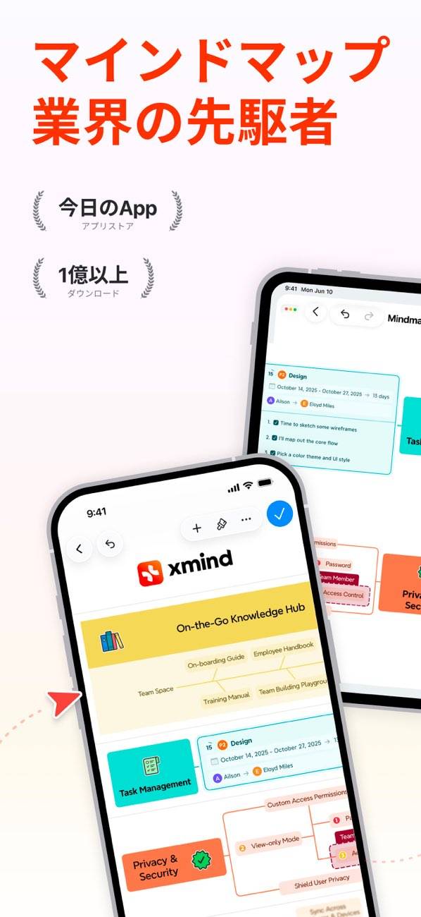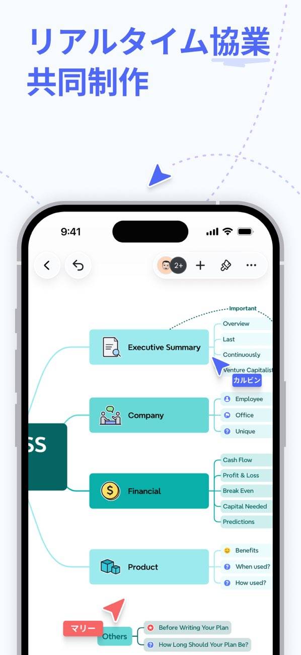 仕事やプロジェクトの全体像を整理できるマインドマップ作成アプリ。30種類のテンプレートや9つの構造を自由に組み合わせて、複雑なアイデアも図で整理できます。