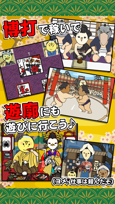 人気カジュアルゲーム「借金あるからギャンブルしてくる」の第3弾です。「仕事は嫌いだけどギャンブル、女の子大好き!」そんなだめ男が江戸時代で天下を目指します。博打で稼いだり妻子に働いてもらったりして年貢を納め、天下を目指しましょう。