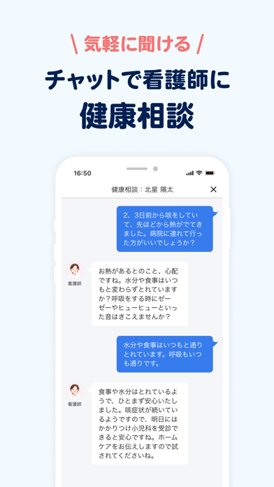 - チャットで看護師に気軽に相談できる。様子見でいいか迷う場面でも安心