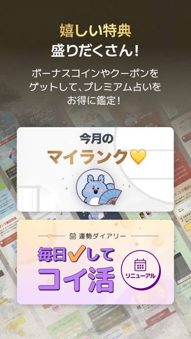 ログインするだけでコインを獲得できるのも魅力的。貯めたコインで有料の占いも楽しめるようになるため、毎日のログインが楽しみに。詳細な占いを無料で体験でき、貴重なアドバイスを受けられます。