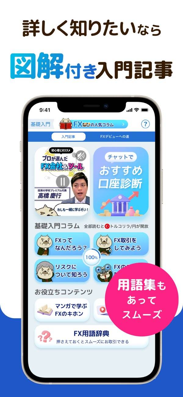FX初心者でも不安なくスタートできる、それがこのアプリの特性です。リアルタイムのデモトレードで投資の世界を体験し、わかりやすい教材で知識を深めることが可能。また実際にFXを始める際におすすめの口座がわかる診断も搭載しています。仕事帰りや休日の空き時間に、初めての投資に挑戦してみませんか?