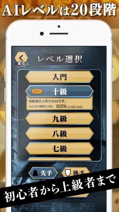 AIと対局できる将棋アプリ。相手の強さを20段階から選べるため、一方的でなく、自分のレベルに合った勝負が楽しめるでしょう。
