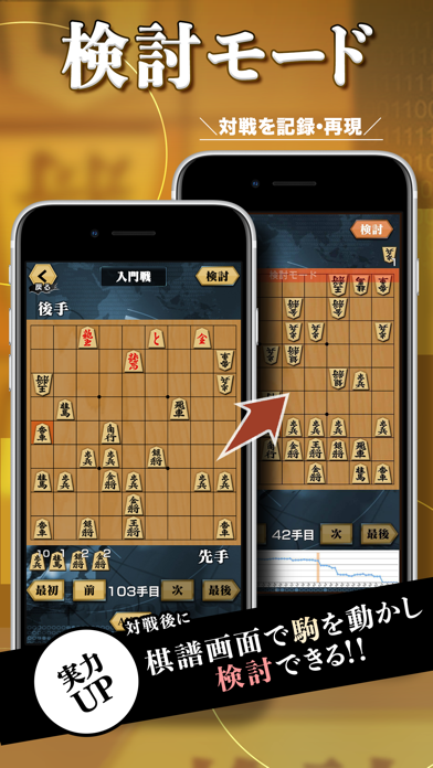 対局後には盤面の評価をグラフ化。どこで優勢だったか、どこで崩れたかを盤面とともに振り返り、指し方を分析できます。また対局時の盤面の駒を動かし、「このときこうしていれば……」をシミュレートできる“検討モード”もあります。