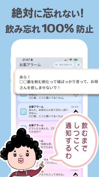 お薬を飲むまで断続的に通知を送り続ける「しつこい」アラームが特徴です。しつこくアラームが鳴ることで、重要なお薬の服用を強く促してくれます。忙しい日々の中でも、薬の飲み忘れを防げるので便利。