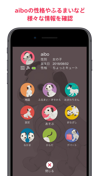 持っているaiboを登録すれば性格や通信状態の確認などができます。ポップな音楽と共に、ワンちゃんと戯れてみてください。いつでもどこでも従順なペットが癒やしてくれます。