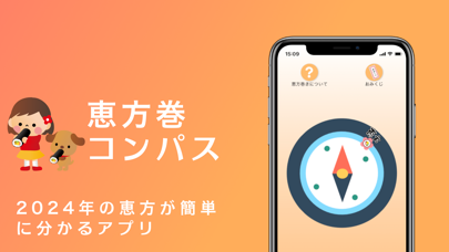 恵方を示してくれるコンパスアプリです。アプリを起動するとすぐコンパスが表示。恵方の矢印にあわせてスマホを動かすと、「この方角が恵方です!」と教えてくれます。