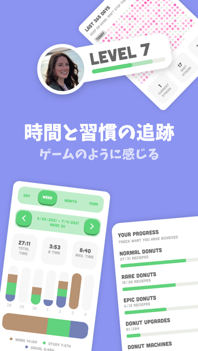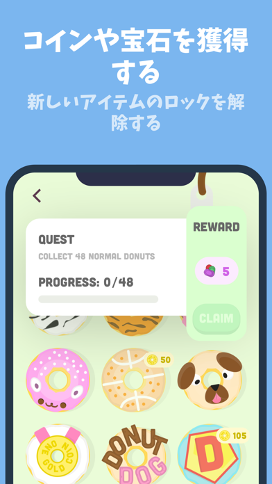 クエストやドーナツのコレクションなど、達成感を得られる要素が盛り込まれています。ドーナツをあげて手に入るコインを使えば、新しいドーナツを解禁したり、ドーナツマシンをアップグレードしたり可能。楽しみながらタスクに集中できますよ。
